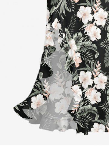 Tropical Leaf Hibiscus Flower Print Hawaii Ruffles Split Dress - Noir - Noir