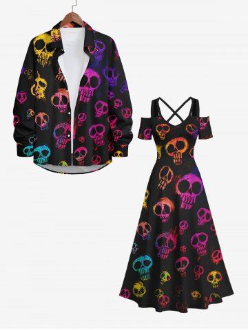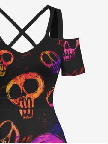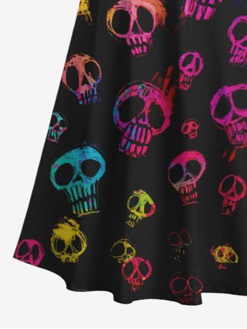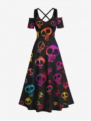 Maxi Robe D'Halloween Costume Colorée Crâne Imprimée à Epaule Dénudée de Grande Taille - Noir - Noir
