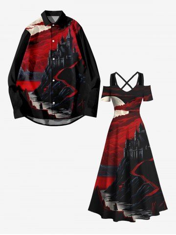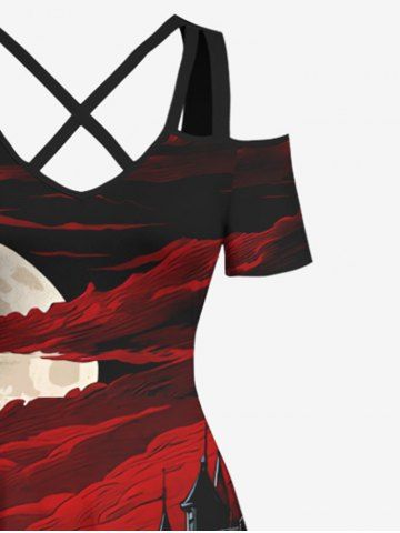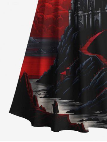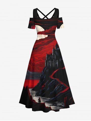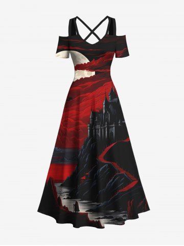 Robes Halloween > Maxi Robe Ligne A Croisée Château et Lune à Epaule Dénudée de Grande Taille