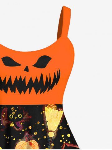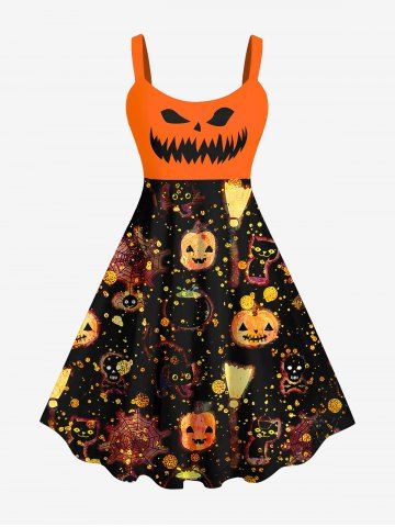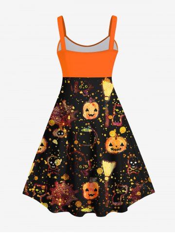 Robe D'Halloween Citrouille et Toile D'Araignée Imprimés Grande Taille à Paillettes - Orange - Orange