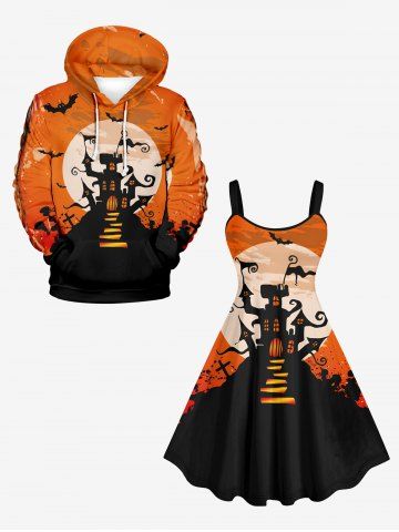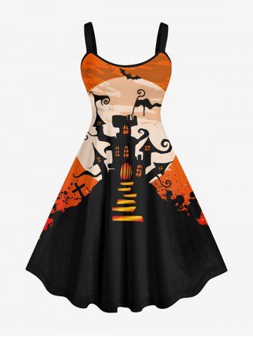 Robes Halloween > Robe D'Halloween Costume Chauve-souris Château et Lune Imprimés en Blocs de Couleurs de Grande Taille