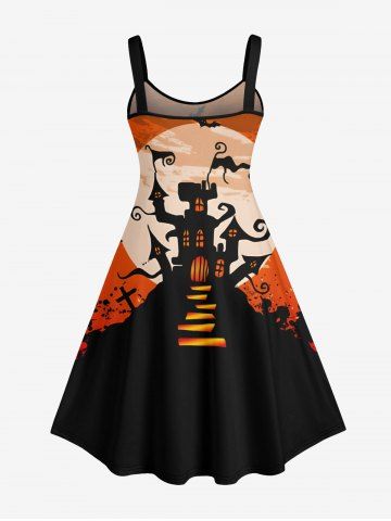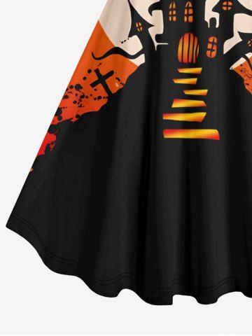 Robe D'Halloween Costume Chauve-souris Château et Lune Imprimés en Blocs de Couleurs de Grande Taille - Noir - Noir
