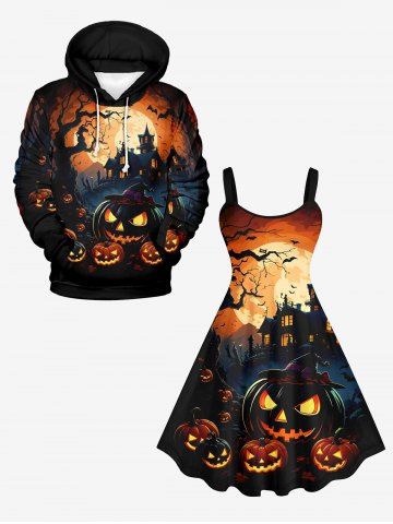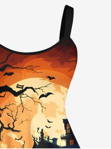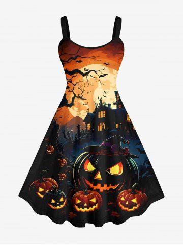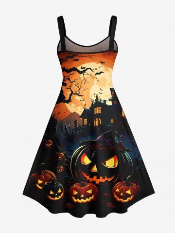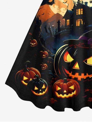 Robe D'Halloween Ligne A Citrouille Lune et Château Imprimés de Grande Taille à Paillettes - Noir - Noir