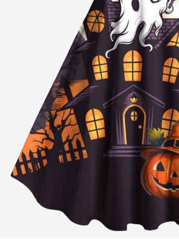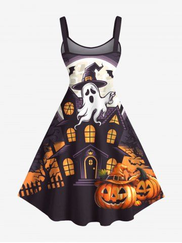 Robe débardeur grande taille avec chapeau d'Halloween, citrouille, fantôme, chauve-souris, arbre, château imprimé - Orange - Orange