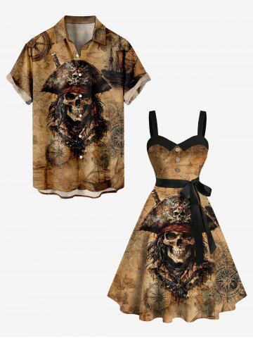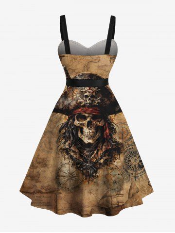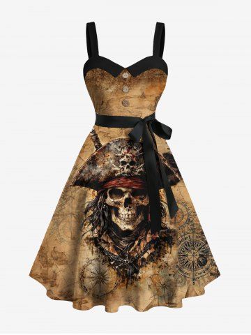 Robe grande taille à col rabattu et ceinture, motif tête de mort, bateau pirate, boutons et imprimé gouvernail - Brun - Brun
