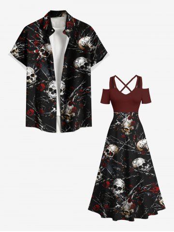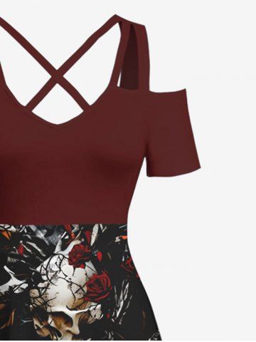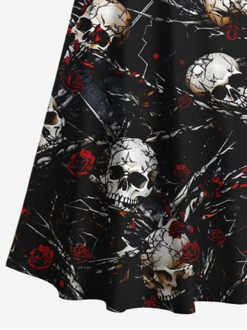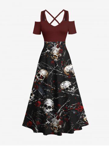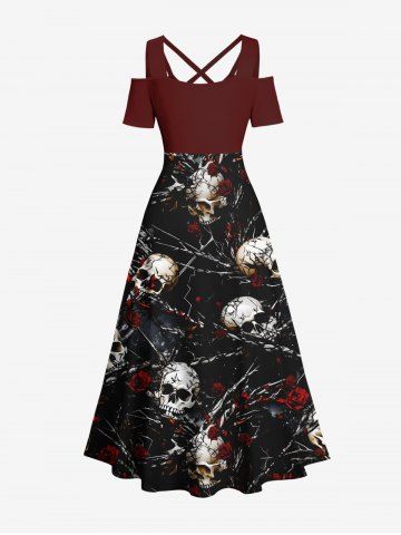 Robes Halloween > Robe longue grande taille à imprimé tête de mort, roses, fleurs et chaînes, épaules dénudées et croisées