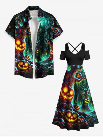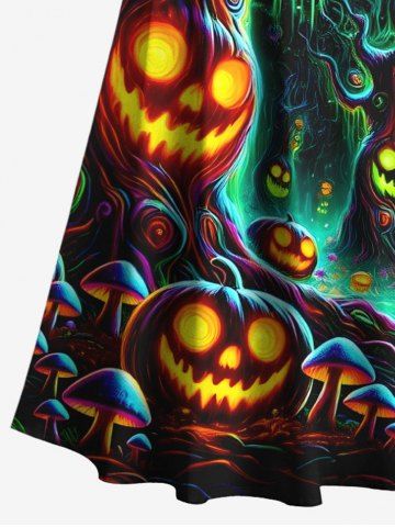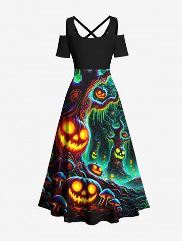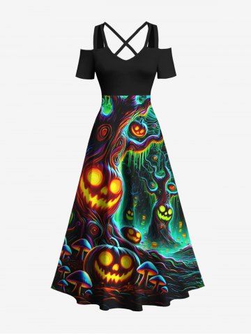 Robes Halloween > Robe longue trapèze croisée à épaules dénudées et imprimé citrouille lanterne arbre grotte grande taille pour Halloween