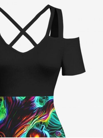 Robe longue trapèze croisée à épaules dénudées et imprimé citrouille lanterne arbre grotte grande taille pour Halloween - Noir - Noir