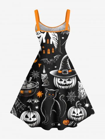 Robes Halloween > Robe trapèze grande taille à imprimé citrouille, chat, sorcière, toile d'araignée, chauve-souris, château, costume d'Halloween