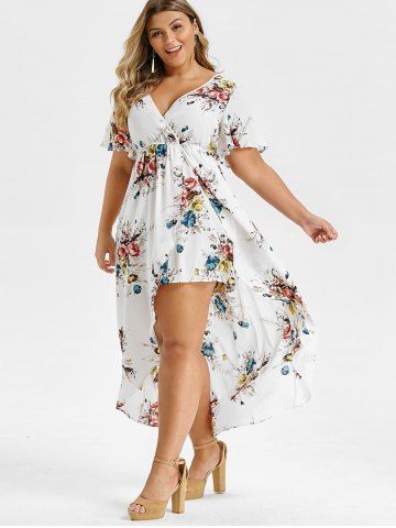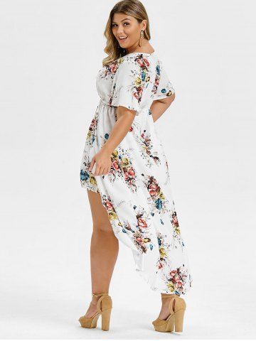 Maxi Robe Haute Basse à Imprimé Fleurie de Grande Taille à Manches de Cloche - Blanc - Blanc