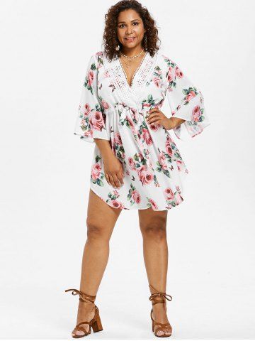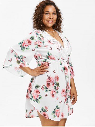 Robe en Dentelle Insérée Fleurie Imprimée Taille à Cordon de Grande Taille - Blanc - Blanc