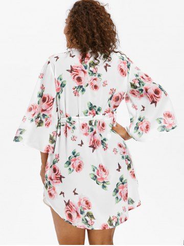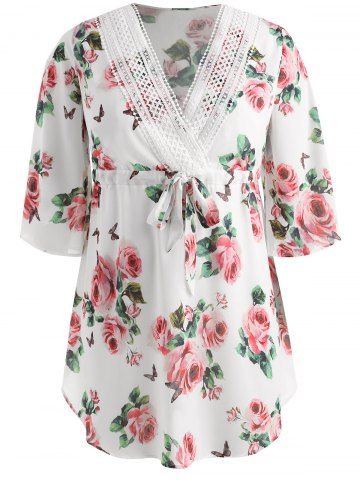 Robe en Dentelle Insérée Fleurie Imprimée Taille à Cordon de Grande Taille - Blanc - Blanc