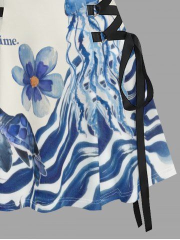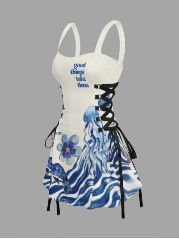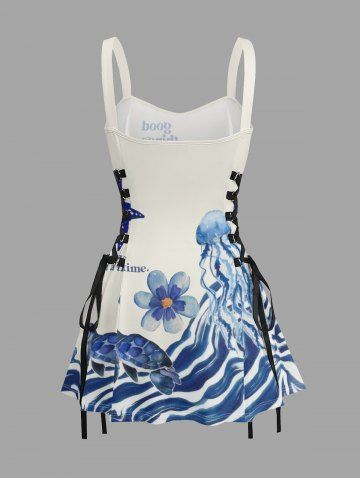 Starfish Jellyfish Turtle Flowers Print Lace Up Hawaii Tank Dress - Bleu - Bleu