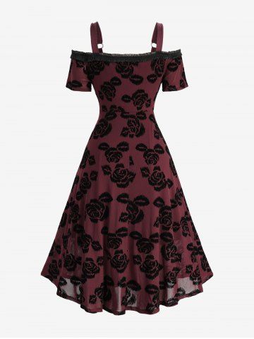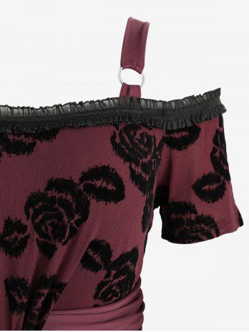 Robe débardeur grande taille à volants, imprimé fleurs roses, bordure en dentelle, épaules dénudées et froncées - Rouge Foncé - 5x | Us 30-32