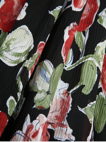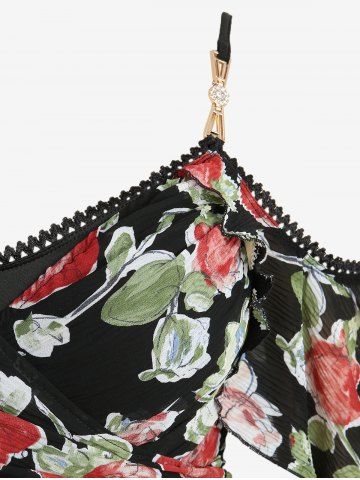 Robe Fendue Superposée Feuille Fleur Imprimée à Epaule Dénudée de Grande Taille - Noir - Noir