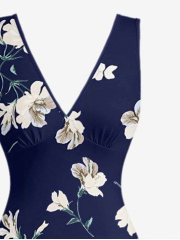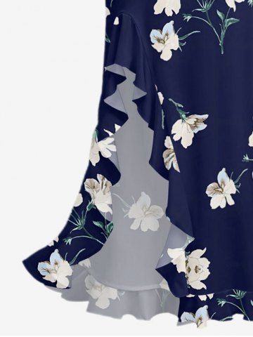 Flowers Leaf Print Hawaii Ruffles Split Surplice Dress - Bleu Profond - M