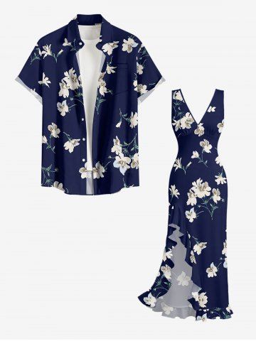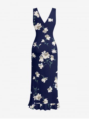 Robes Moulantes> Flowers Leaf Print Hawaii Ruffles Split Surplice Dress