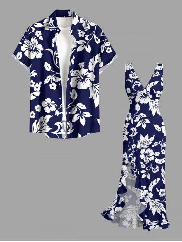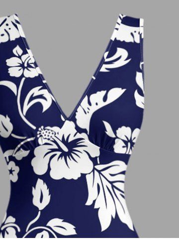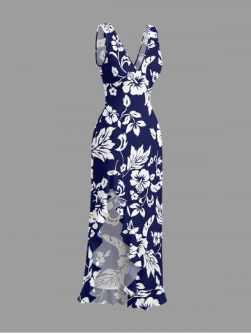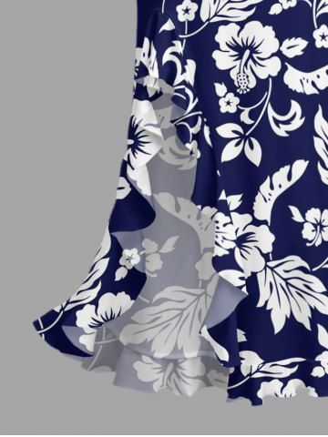 Robe hawaïenne à imprimé feuilles et fleurs d'hibiscus, volants et fente cache-cœur - Bleu Profond - Xl
