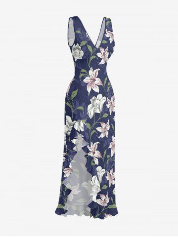 Robes Moulantes> Robe hawaïenne à imprimé fleurs, feuilles et branches, à volants et fente