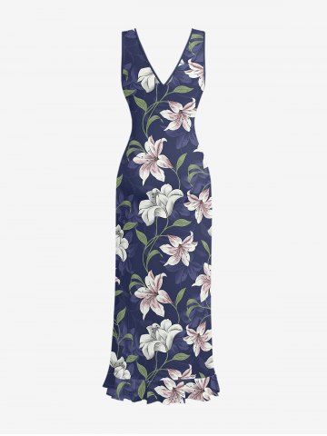 Robes Moulantes> Robe hawaïenne à imprimé fleurs, feuilles et branches, à volants et fente