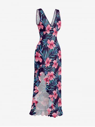 Robes Moulantes> Robe hawaïenne à imprimé floral d'hibiscus et feuilles tropicales, fendue et à volants, style hawaïen