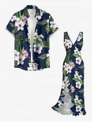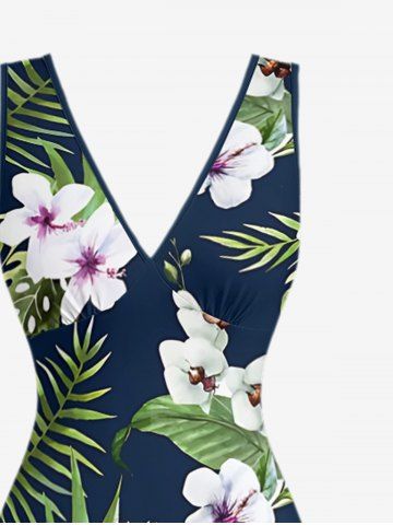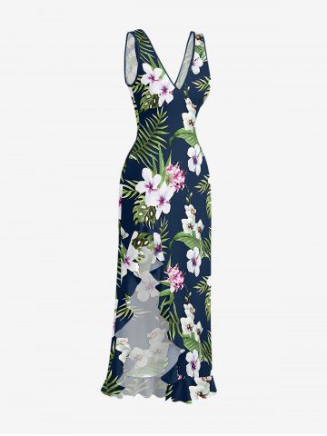 Robe hawaïenne à imprimé floral d'hibiscus et feuilles tropicales, fendue et à volants, style hawaïen - Bleu Profond - Xs