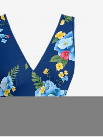 Robe hawaïenne à imprimé floral tropical et feuilles, à volants et fente - Cadetblue - Xs