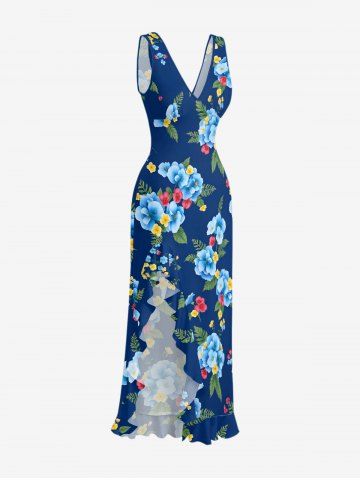 Robe hawaïenne à imprimé floral tropical et feuilles, à volants et fente - Cadetblue - L
