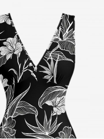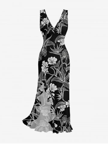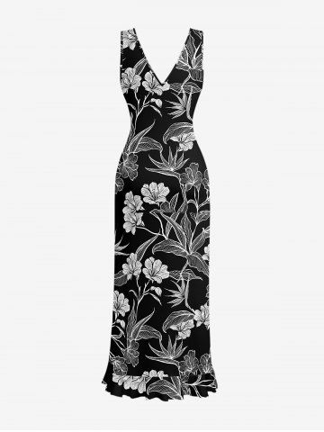 Robe hawaïenne à imprimé floral tropical et feuilles, à volants et fente - Noir - Noir