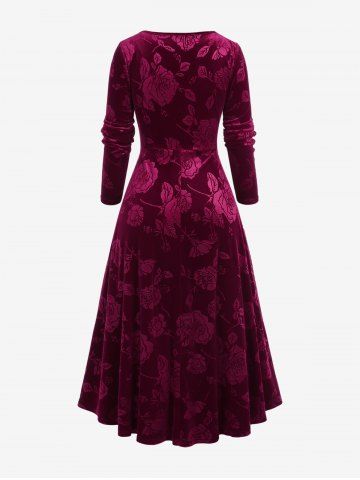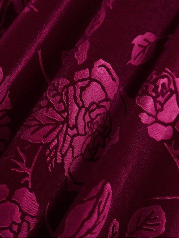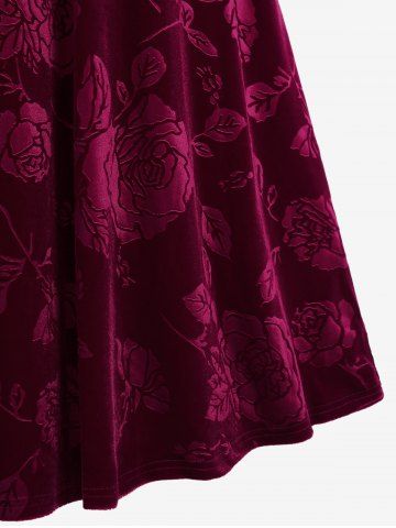 Robe Fleurie Bouclée Grande Taille avec Strass en Velours - Rouge Foncé - L | Us 12