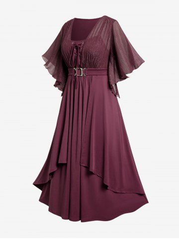 J*****n4Plus Size Lace Up Buckle Grommet Layered Butterfly Sleeve DressColor: CONCORD Size: 2X | US 18-20I rated the fit as true to size, but this is correct for the dress or bottom only (I am a 2X). The top (jacket) is just a tad small for my shoulders and bust, and since it is a separate piece, it rides up. I may try to stitch the two pieces together to make this work. The colour, material, and design otherwise is all quite nice and I am happy with dress portion. It also pairs nicely with a white sweater I ordered on here.