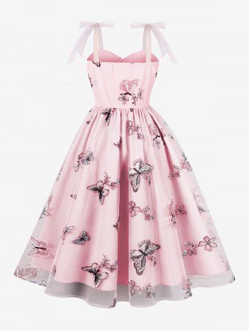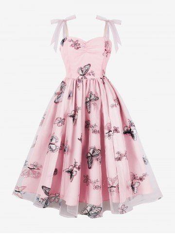 Robe Vintage Fleur Papillon Brodé en Maille Zippée avec Nœud Papillon - Rose Clair - Rose Léger