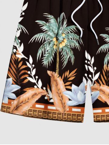 Plus Size Coconut Tree Tropical Leaf Flower Print Hawaii Drawstring Beach Shorts For Men - Marron Foncé - 2xl