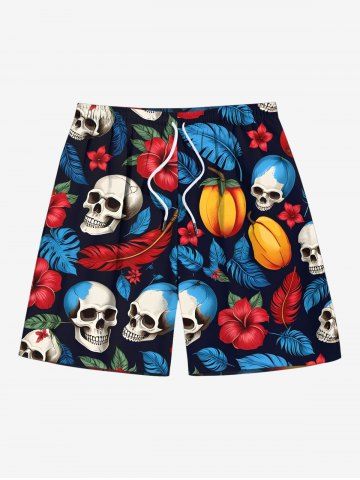 Shorts> Short de plage grande taille à imprimé tête de mort, feuilles tropicales, hibiscus, fleurs, hawaïen, cordon de serrage, pour homme