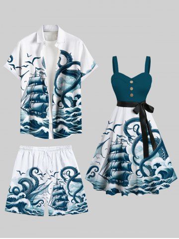 Shorts > Short de plage grande taille avec cordon de serrage, imprimé pieuvre, voilier, vagues, oiseaux, croisière hawaïenne, pour homme