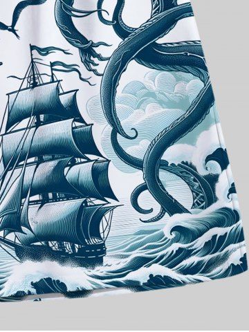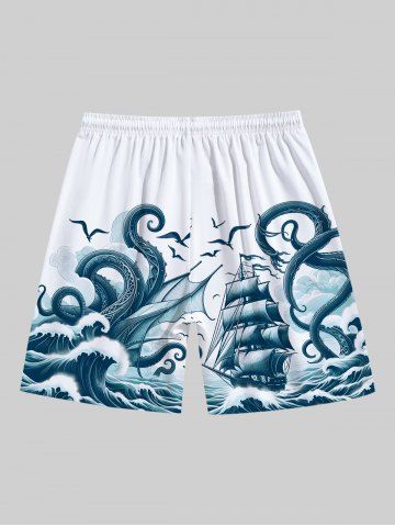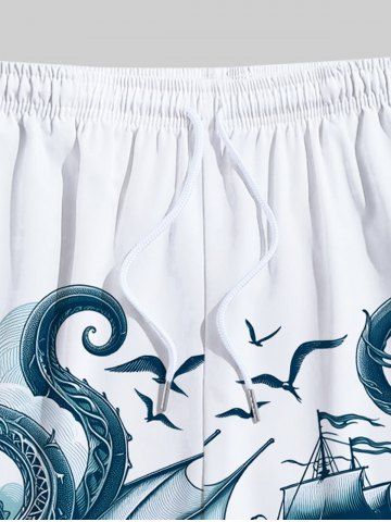 Short de plage grande taille avec cordon de serrage, imprimé pieuvre, voilier, vagues, oiseaux, croisière hawaïenne, pour homme - Blanc - Blanc
