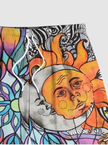 Short de Plage Hawaïen en Blocs de Couleurs Lune et Soleil Imprimés de Grande Taille avec Cordon - Multi-a - L