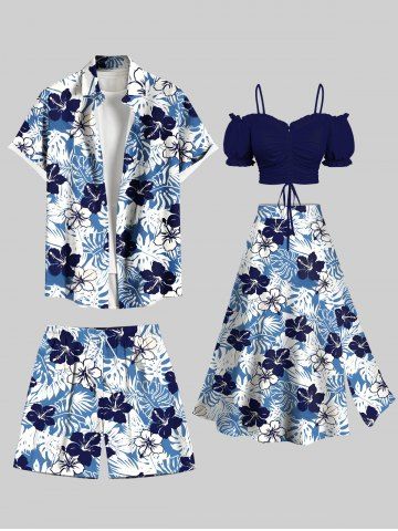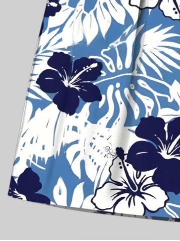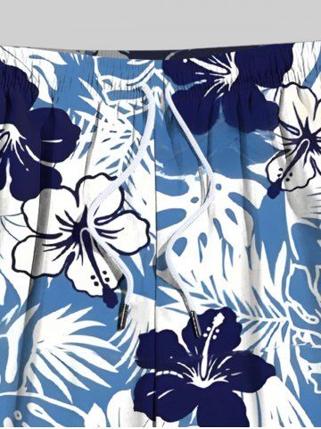 Short de plage hawaïen grande taille à imprimé feuilles tropicales et fleurs d'hibiscus, avec cordon de serrage, pour homme - Bleu - Bleu