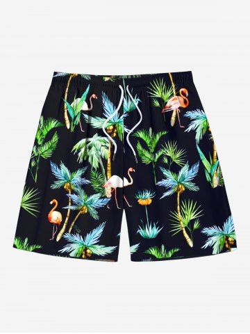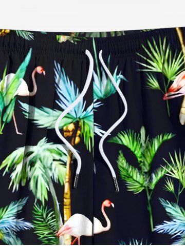 Short de plage hawaïen grande taille à cordon de serrage et imprimé flamant rose et cocotier pour homme - Noir - Noir
