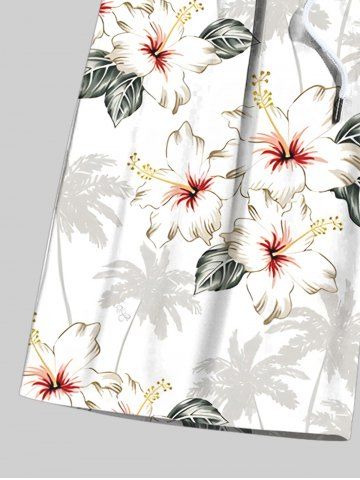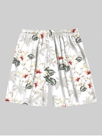 Short de plage hawaïen grande taille à imprimé feuilles de cocotier et hibiscus avec cordon de serrage pour homme - Blanc - Blanc