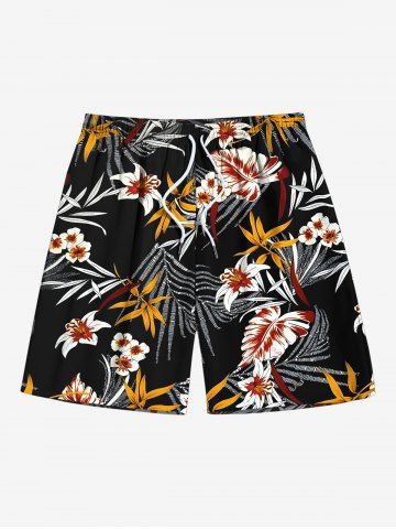 Short de plage hawaïen grande taille à imprimé floral et feuilles tropicales avec cordon de serrage pour homme - Noir - Noir