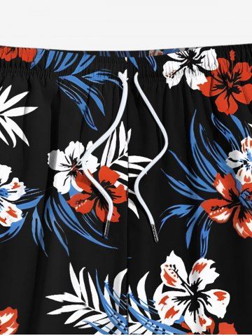 Short de plage hawaïen grande taille à imprimé feuilles tropicales et fleurs, avec cordon de serrage, pour homme - Noir - Noir