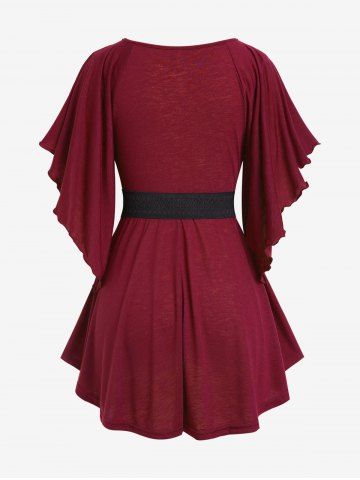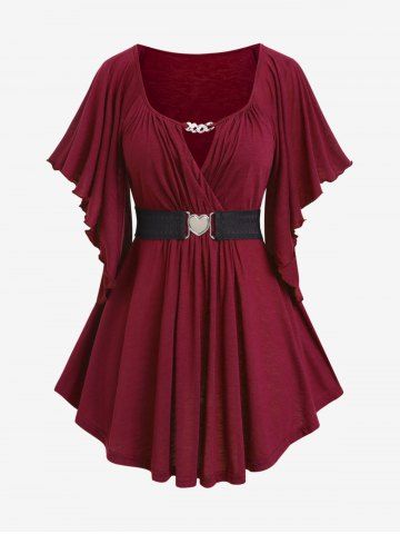 T-shirt Cache-Coeur Ceinturé à Manches Papillon et Chaîne Grande Taille - Rouge Foncé - 3x | Us 22-24