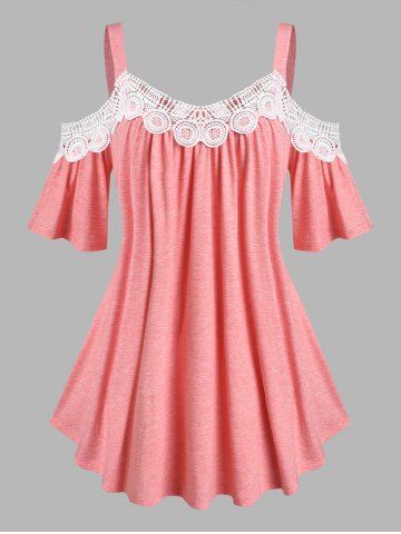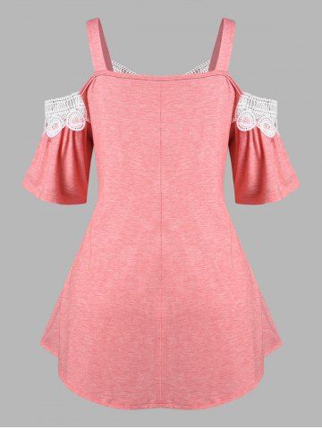 B*****b5Plus Size Lace Panel Plunging Neck TeeColor: LIGHT PINK Size: 3XI have a tank underneath this darling top so please excuse that. This is so pretty with sparkles added to the center of the flowers on the sleeves, makes the top really stand out. The lace on the sleeves is really sturdy and will last, the vee neck lace is a heavier matetial which is exceptional. The material is soft and comfortable. Shipped fast and packaged nicely. High quality design and made very well!
