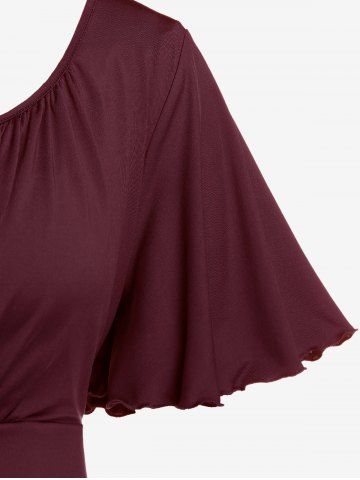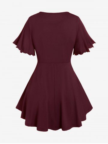T-shirt Superposé de Grande Taille à Manches Bouffantes à Volants avec Trou de Serrure - Rouge Foncé - 1x | Us 14-16