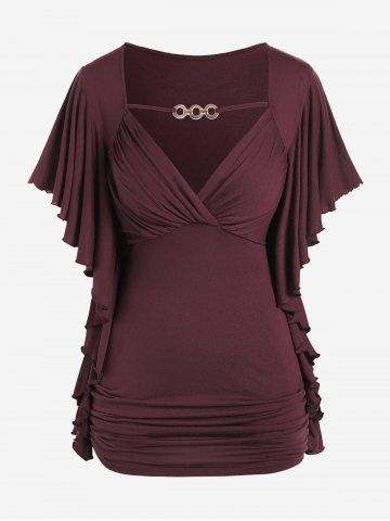 T-shirt Superposé en Couleur Unie à Manches Papillon de Grande Taille à Volants - Rouge Foncé - 2x | Us 18-20