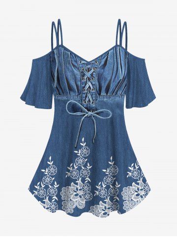Plus Size Lace Up Flowers Ruched Denim 3D Print Cold Shoulder T-shirt - Bleu - Bleu