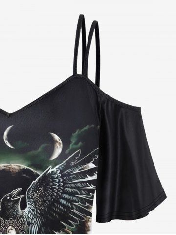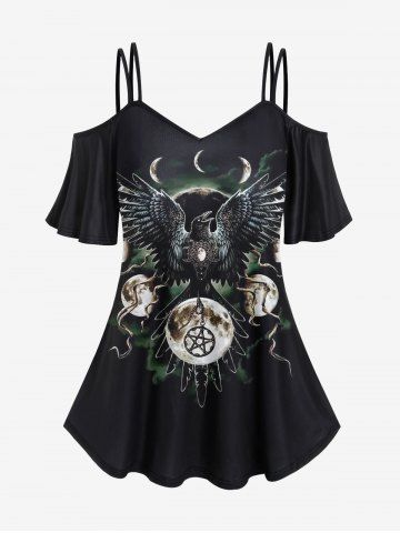 T-shirt à Bretelle Etoile Lune Aigle Imprimés à Epaule Dénudée de Grande Taille - Noir - Noir