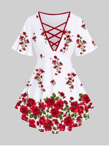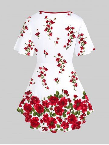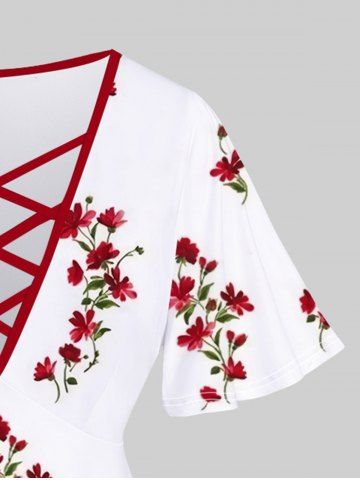 T-Shirt à Manches Courtes avec Croisés et à Imprimé Feuilles et Fleurs Grande-Taille - Rouge - Rouge