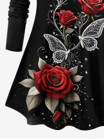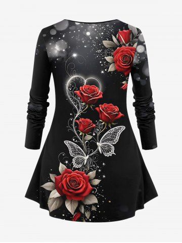 T-shirt à manches longues grande taille pour femme, imprimé rose, papillon, cœur et pois lumineux, spécial Saint-Valentin - Noir - Noir